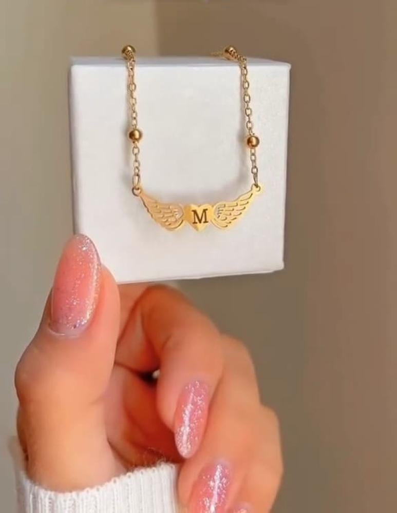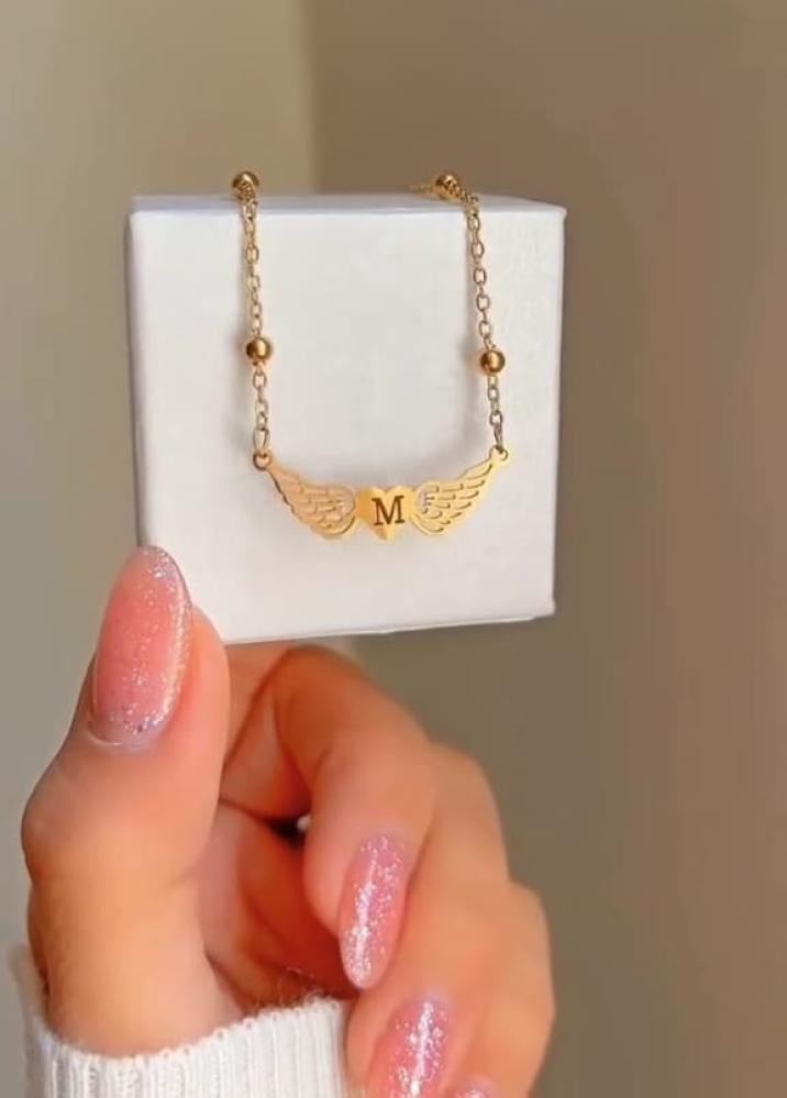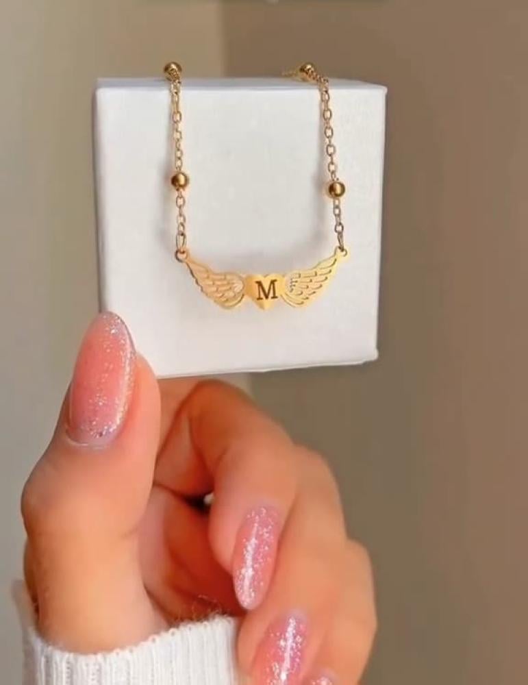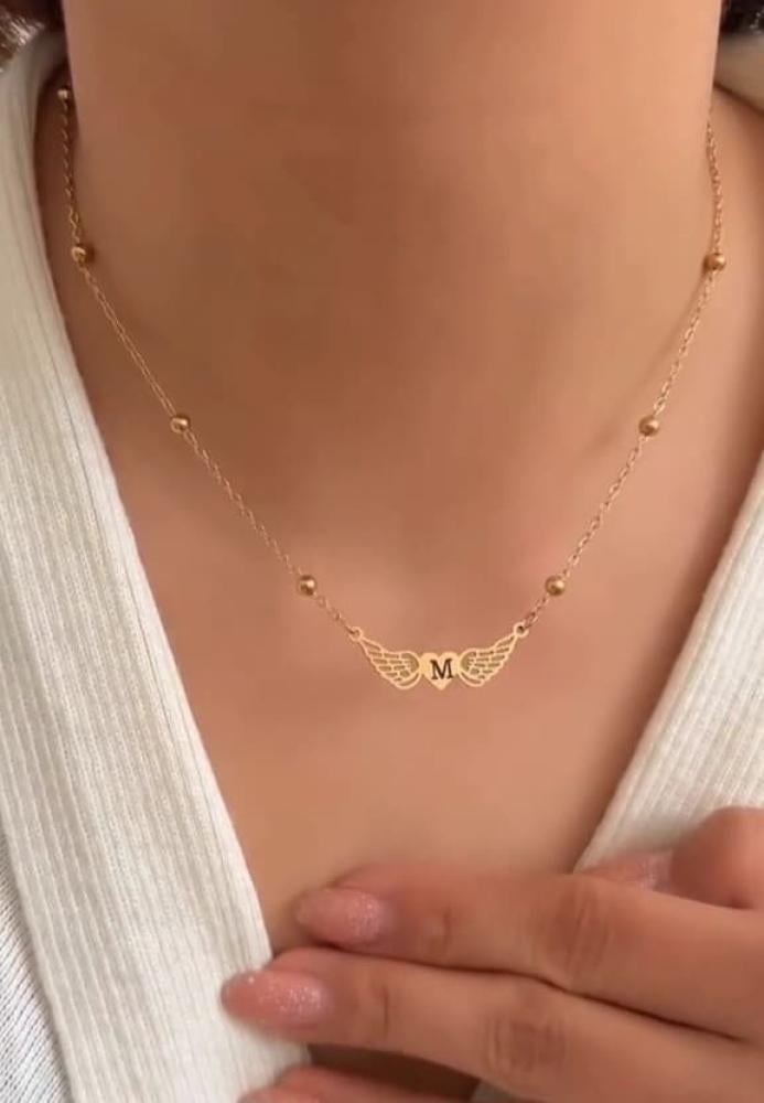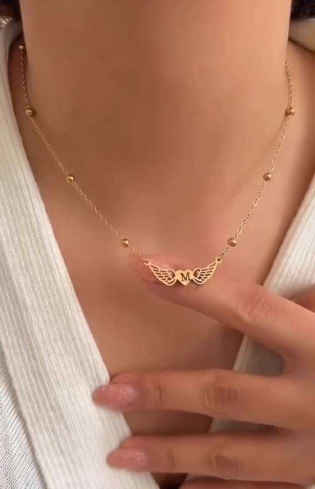 سلسال أنثوي فاخر بتصميم جناحين ناعم، يتوسطه حرف أو اسم خاص بك.