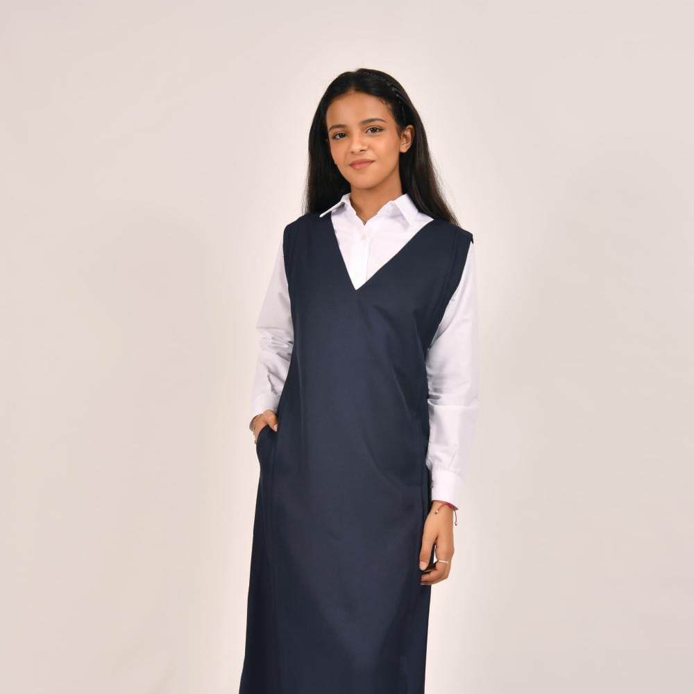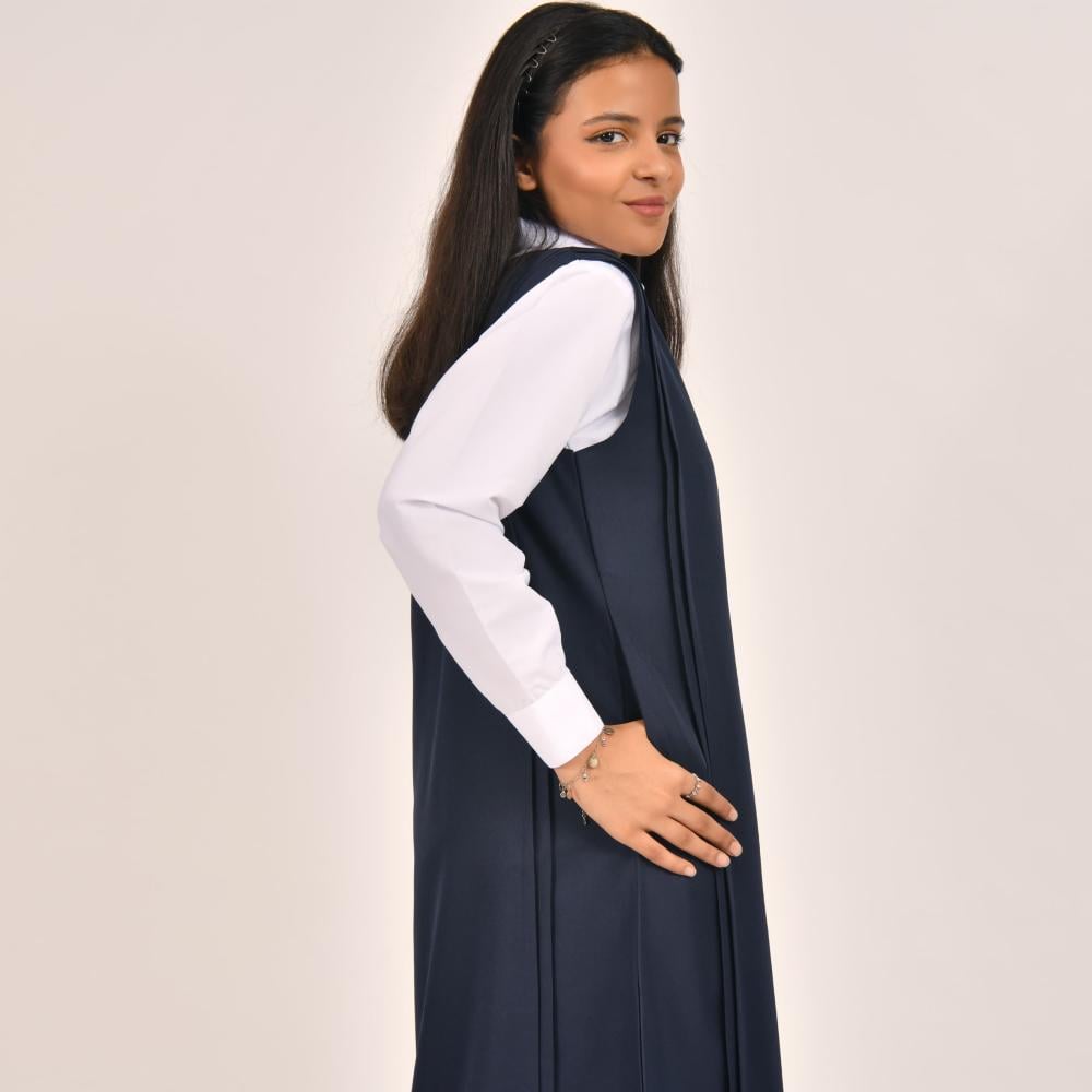 مريول ثانوي كحلي بقصة مستقيمة مع تقليم على الجانبين وجيوب مخفية